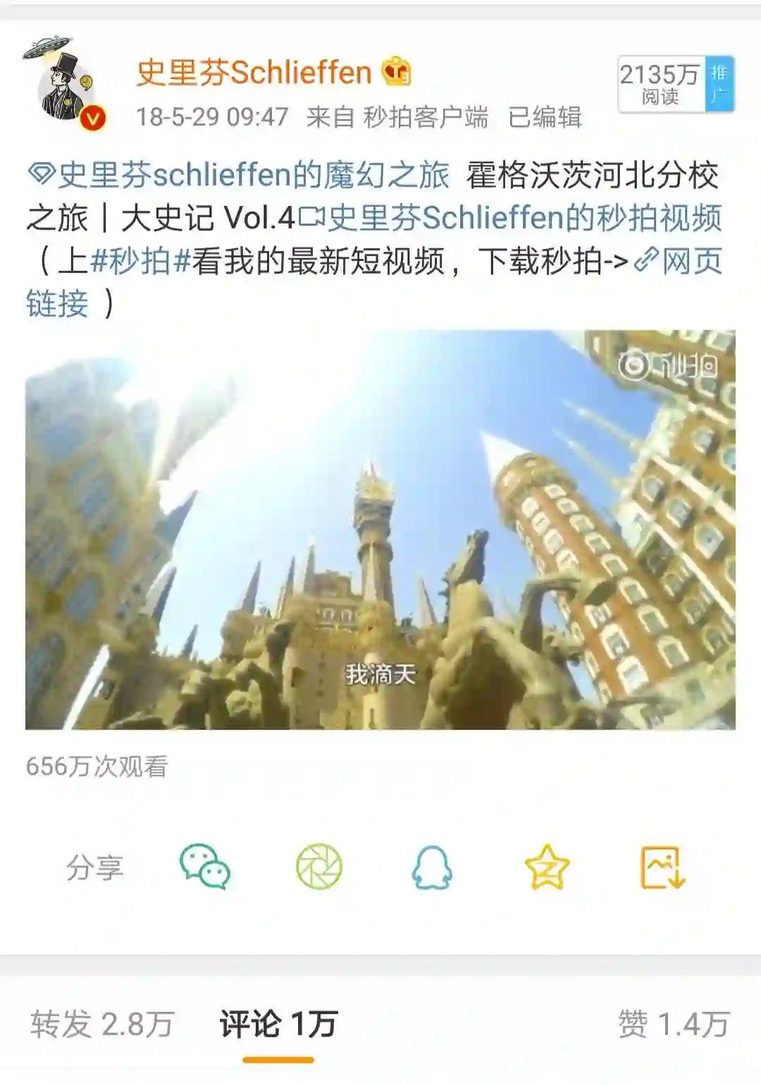 经过3期试水后,去年5月29日,史里芬在微博发布了自己第一期正式Vlog:《霍格沃茨河北分校之旅》