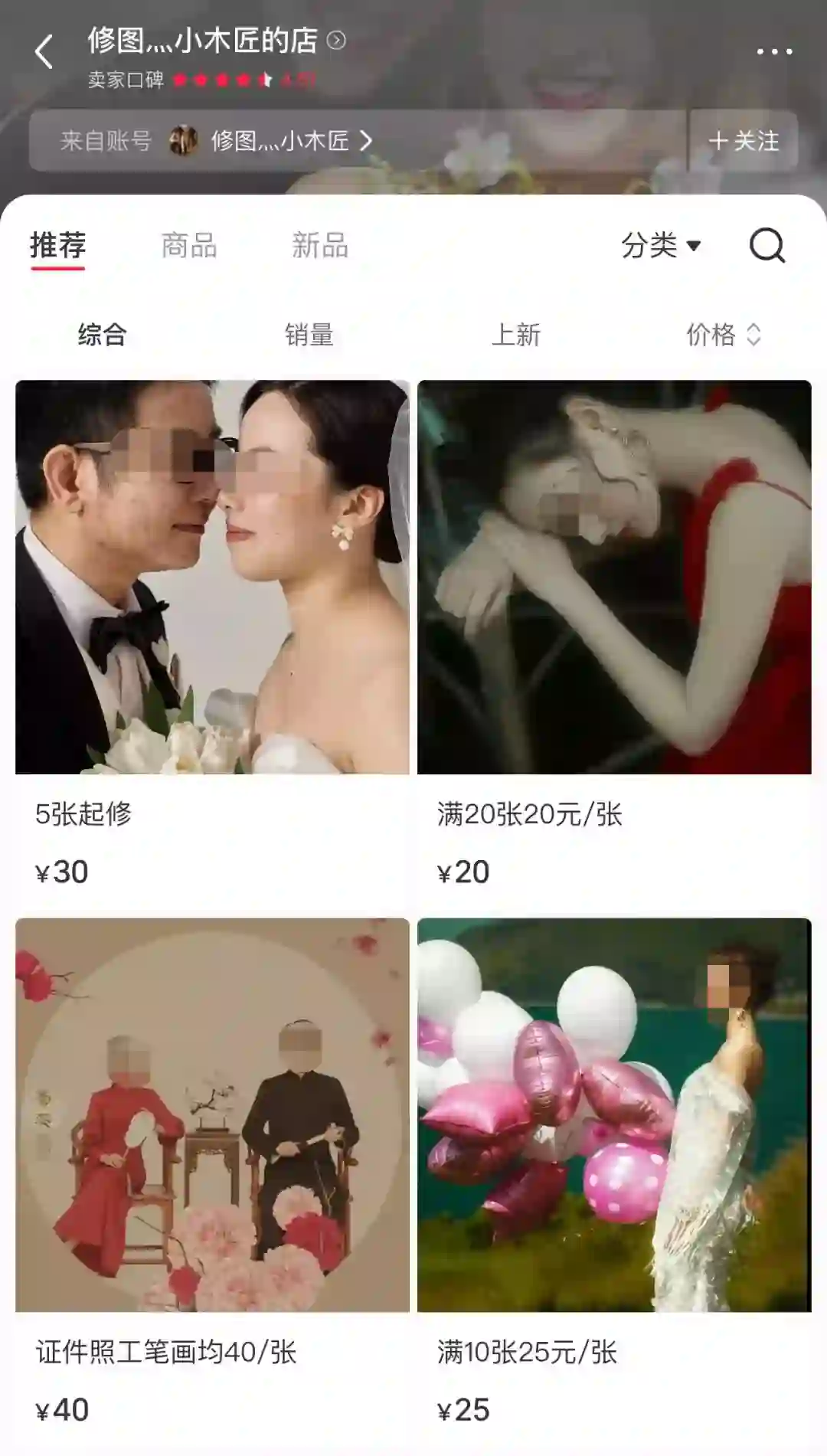 据观察,小红书站内“修图“相关的商品数量超过1900件,其中位居前列的是一家名为“修图小木匠”的店铺,店内一共上架了4个链接,累计购买人数达到5682人,累计成交额达到13.47万元。