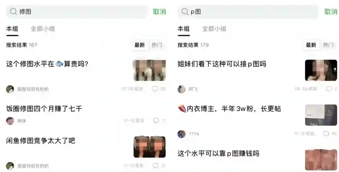 在豆瓣小组”副业失败的一天”,累计有346篇帖子讨论兼职修图、P图在闲鱼、小红书等平台的可操作性,其中“门槛低”是高频提及的关键词,但与之同时出现的问题也有“曝光差”、“接单难”、“精力投入与所获报酬不成正比”等。
