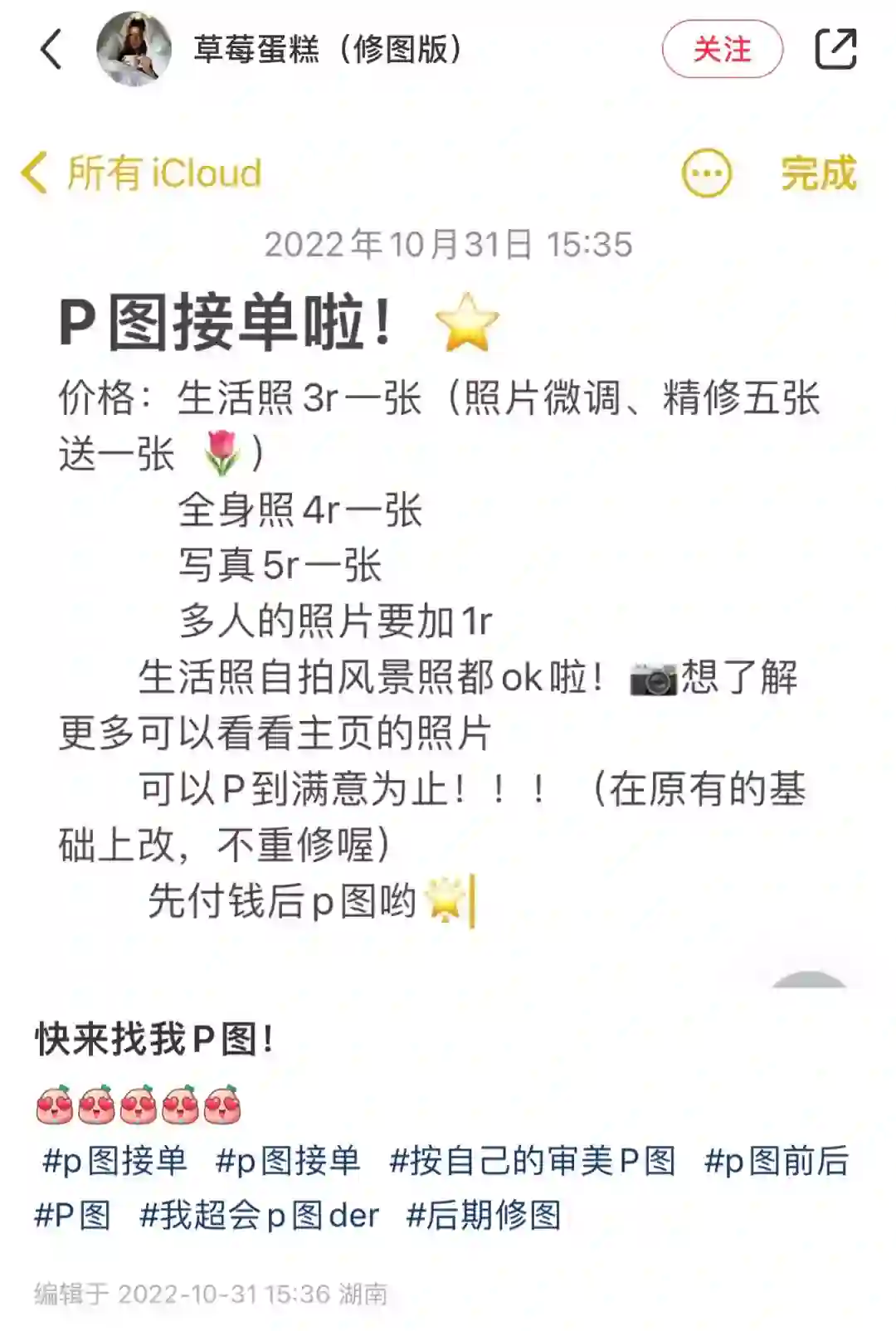 今年10月,刚上大二的“草莓蛋糕(修图版)”(下文简称“草莓蛋糕”)在小红书发布了一则接单修图的广告,并将其置顶到首页,宣告自己的修图小生意正式开张。