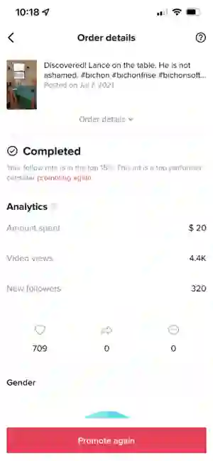 用我的 20 美元,Lance 获得了 320 名新闻关注者、4,400 次视频观看和 709 次点赞。