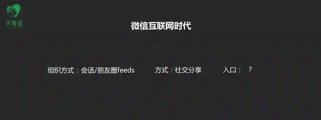 2014 年,有一个大佬提出了微信互联网这个概念。微信逐渐成为超级入口,在 2014-2016 年早期很多做公众号的分到了第一杯羹。微信互联网时代来了、小程序来了,有什么玩法变化呢。我们发现在微信时代,我们获取信息、跟用户互动的方式在会话和朋友圈 feeds、公众号,其中公众号作为增长手段的红利时代已经过去了,还可以做用户沉淀、召回和留存。