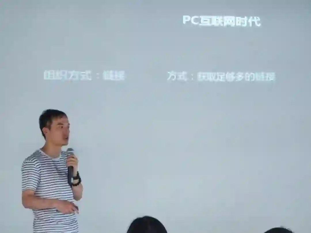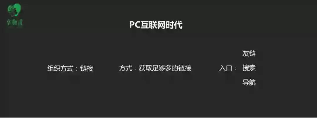 从我自己去做 PC 互联网时代推广和增长这个事情来讲,分三块来看,我们看到在 PC 时代获取信息的时候,用的是 link 的方式,我们所有获取信息的方式是通过域名、通过链接跳转来。