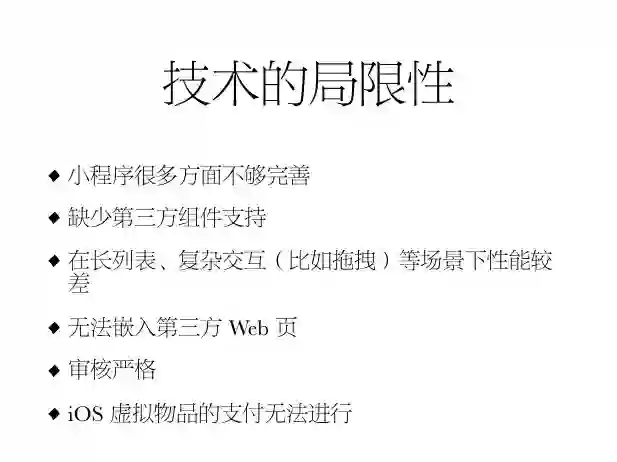 今天小程序的现状,后面会有越来越多的局限性。从技术的角度,小程序有一些是做不到的。比如多媒体、滤镜是很困难,因为它的处理能力是不如原生系统的。