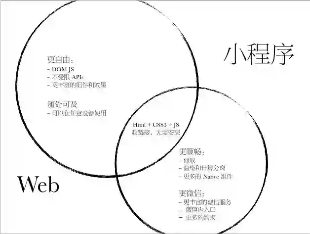 从技术角度来看,小程序和 Web 很像,他们的核心技术解决方案是一样的。但是毫无疑问,核心差别在于,Web 更灵活,所有平台对 Web 都是友好的。但是小程序在微信里是不能被放任各种能力,如果这么开放就没有办法做到极致。