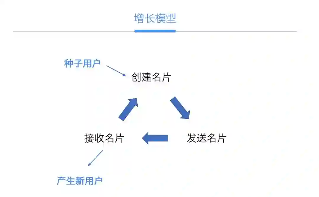 我们在最初抓的一批种子用户,他们对产品是有一定的用户感知度的。他大概知道用你这个产品能做什么,这些用户就创建了自己的电子名片,当他需要去发名片的时候,他就有一定的概率去发这个电子名片,这就有人点进来,在微信小程序这个领域,每点进来一个就会算成新用户。这样,新用户他就有一定的比例去创建自己的电子名片,这就会把新用户滚动起来。