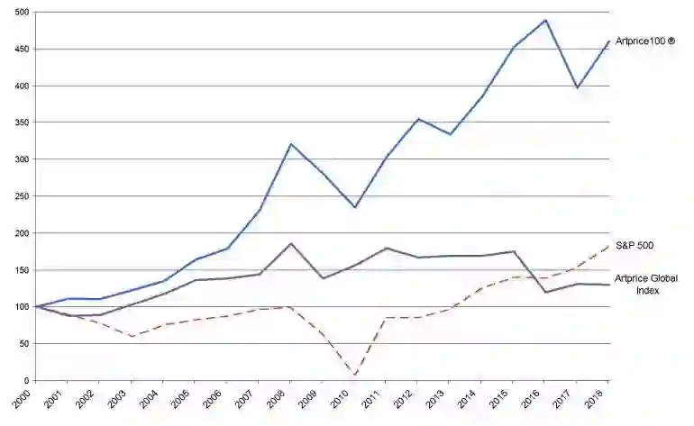 我们可以看到从 2000 年 1 月 1 日至 2018 年 12 月 31 日,Artprice100® 的表现优于 S&P500,涨幅超过 250%。