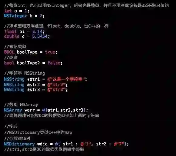 接下来我们来看一下基本的数据类型,我就说一些比较常用的吧,C++的我就不说了。 OC中的数据类型