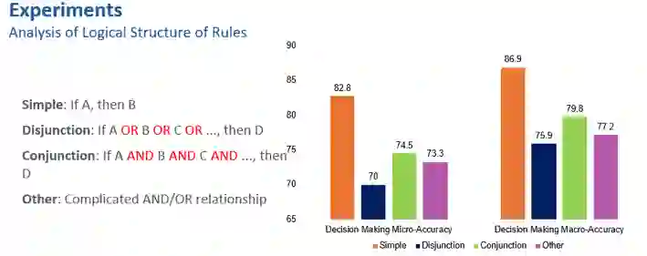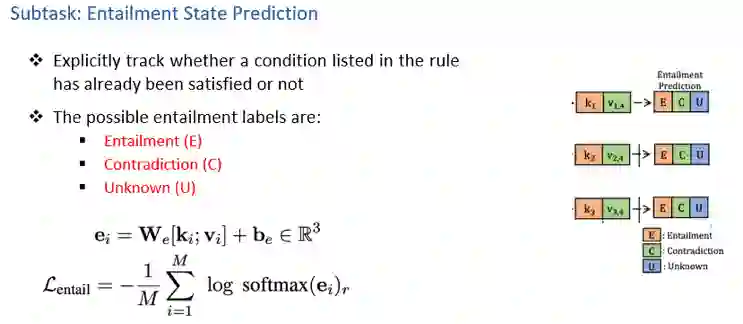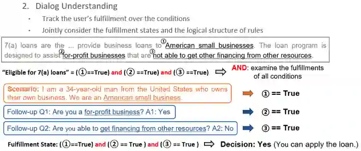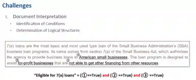 3.1 问题提出负采样进一步,讲者介绍了第二项工作,该工作与前者的侧重点有所不同,存在两个差异:第一,document interpretation,主要由于第一项工作只是简单的对句子进行了一个切分,但实际上有些conditions(比如,上述例子中的American small business for profit business)是长句子中从句的条件,因此,第二项工作侧重如何去理解这样的条件。比如,能申请7(a)贷款,需要满足(①==True and ②==True and ③==True)的条件,这在第一项工作中是没有被建模的。