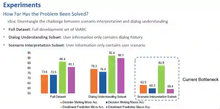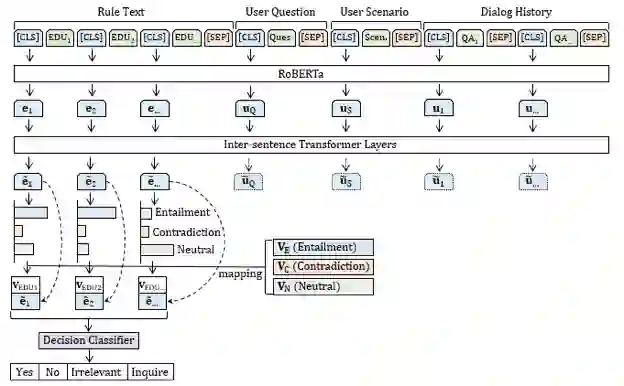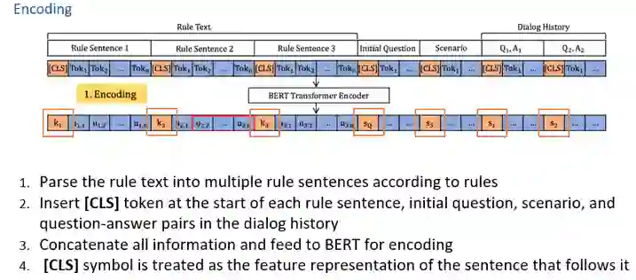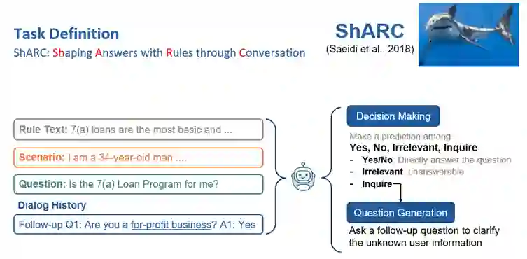 图1定义该项任务常用的数据集是ShARC (shaping answers with rules through conversation 的简称),数据集的设定是:给定Rule Text;用户描述自己的Scenario(Background);用户提出question;已有的问答(Dialog History)。整个过程可以概述为,由于用户给定的background往往不明确,机器需要进行几轮交互,然后从交互中获取一些跟规则有关的信息,然后告诉用户具体答案。整个任务有两个子任务:任务一,整合Rule Text,Scenario,Question以及通过几轮交互从用户获取的信息,作为模型输入,然后做出决策(Decision Making)。该决策包含四种类型:一种是根据现有的信息能够作出yes or no 的决策;或者有些情况下,用户的问题可能与给定Rule Text无关,或根据Rule Text并不能解决问题,则会出现unanswerable的答案;另一种情况是Rule Text中需要满足很多条件,但有些条件机器不确定是否满足,需要作出inquire的决策,主动从用户那里获取更多信息,直至几轮交互后能够作出yes or no的决策。任务二,如果生成的决策是inquire,则需要机器问一个follow-up question,该问题能根据Rule Text引导用户提供一些没有提供的信息,便于进一步的决策。