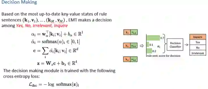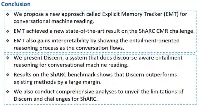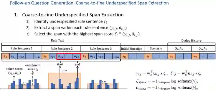 2.1 模型介绍负采样针对于该任务,讲者主要介绍了两项工作,首先是发表于ACL2020的文章“Explicit Memory Tracker with Coarse-to-Fine Reasoning for Conversational Machine Reading”。该工作的贡献有两个:a. 针对决策,提出了explicit tracker,即能够显示的追踪文章中条件是否被满足;b. 采用coarse-to-fine方法抽取Rule Text中没有被问到的规则、条件等。