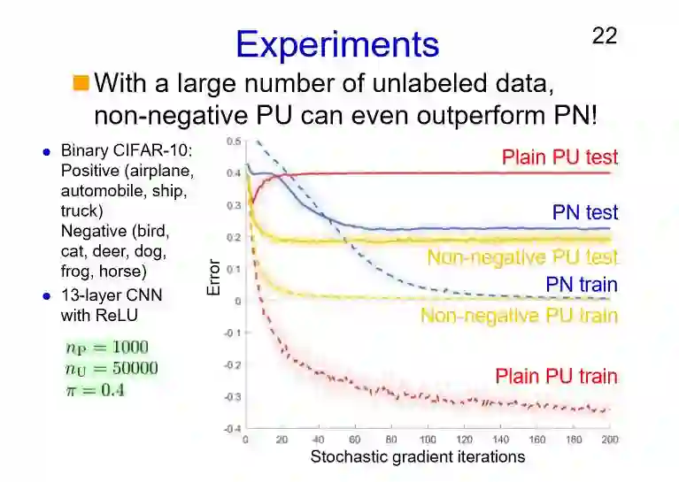 最后我们看一下实验结果:在线性模型当中,可以在测试数据上收敛,当然现在这样的方法只能用于线性模型。虽然没有办法获得一个更通用的经验,但是我们可以能够对于这样的偏差预估性的方法来进行改良,兴许将来有更好的应用。所以,我们在CIFAR10当中创建了很多的正类的数据,蓝色线代表PN测试。在这里可以看到,如果np等于1000错误率下降非常快;如果说是对于非负的测试数据,比如说就是这条黄色线和蓝色虚线的话,它的错误率下降就并不是那么的明显;如果说我们使用一些ReLU方法,PU做的比PN要好的多。