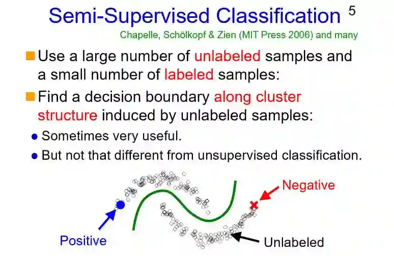 我非常喜欢11年前提出另一种方法的论文:由于我们有大量的无标注数据和少量的标注数据,那么基于少量的标注数据就能在一定程度上找到边界,然后结合所找到的边界和大量无标注数据的聚类结果,从而找出更多的边界。这就是半监督分类。