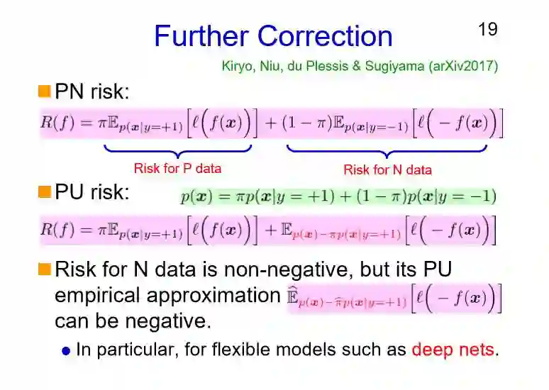 我们再来看一下之前的PN的风险函数公式,就是基于P数据和N数据的风险对U数据的分类风险进行估计。根据这个定义,N数据的风险是非负类的,但是它是PU的样本,在现实当中我们要对样本进行估计。所以说PU可能是会为负的,因为这个是会有一个负号,通常是应该是负号的,但有可能这个差会是负的,特别是对于可扩展性较高的模型来说,比如说像深度网络是会出现这个情况。
