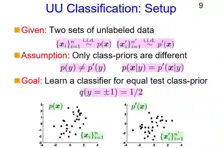 那么我们是怎样对无标注的数据进行分类的呢?假设我们有两个未标注的数据集,它们唯一的不同在于类先验(class-priors,即所属的类别)的不同。它们的函数分布如图中的左右下角,数量上各占50%左右,其实我们并不需要知道具体的比例。基于这种假设,我们需要训练一个分类器,而基于无标注数据的训练是极具挑战的。