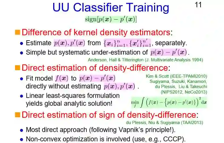 接下来的做法都是很直观的。因为我们要处理的是一些未标注数据,第一种方法是做核密度的估计,我们对两类数据点对应的p(x)和p’(x)进行估计,从而计算它们之间的差值,这样能够很自然地解决分类问题。然而,遗憾的是这种方法虽然简单,但有可能对p(x)-p’(x)的差值产生了低估,这是因为对p(x)和p’(x)的估计函数过于平滑所导致的。