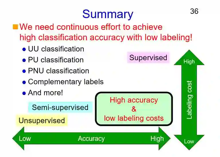 最后我们做一个总结,我们最关注的是底下的这栏,也就是高精确性,但同时也希望需要的标注成本能够尽量的低。我们在UU、PU、PNU和互补性标签分类上,都希望能够实现高精度低标注成本的目标。