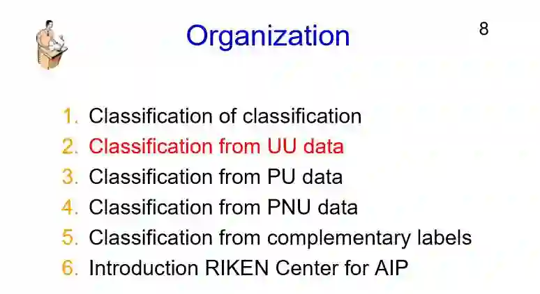 下面是今天演讲的议程,接下来会给大家介绍四种不同的分类方法,后面如果有机会我会介绍一下理化学研究所AIP研究中心。