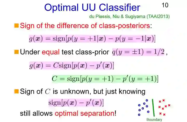 具体的公式转换如下图所示,它背后的理论是正负数据分类风险满足一定的边界条件,具体的细节在这里就不细说了。这是最优的方法,我们可以通过PU的学习,从PU的数据中得出PN的信息。