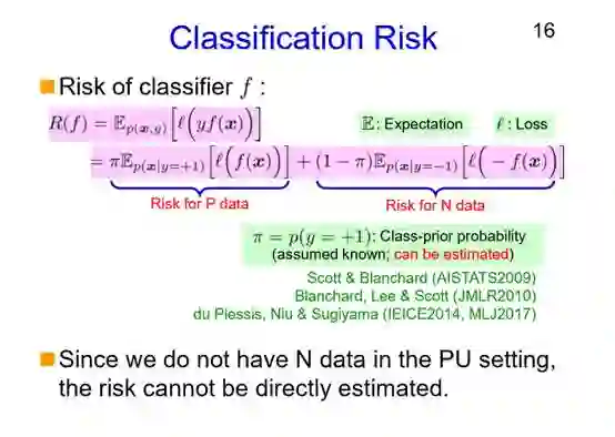 我们用到了损失函数,用了l表示; y是用f(x)表示;我们用R(f)表示风险函数,代表数据分类的风险,可以看到风险函数包括正类数据的分类风险以及负类数据的分类风险。在今天的演讲当中我们为了把它讲的简单,这里实际是要通过这些数据来进行估计的。