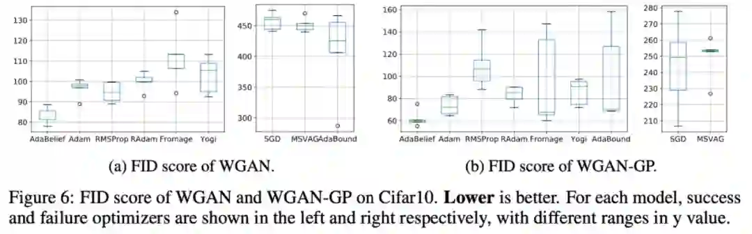 研究者利用Wasserstein-GAN(WGAN)和WGAN-GP进行了实验。对于每个优化器,在其最佳超参数设置下,研究者进行了5轮实验,实验结果如图6和图7所示。AdaBelief明显由于其他优化器,并且其FID分值最低。