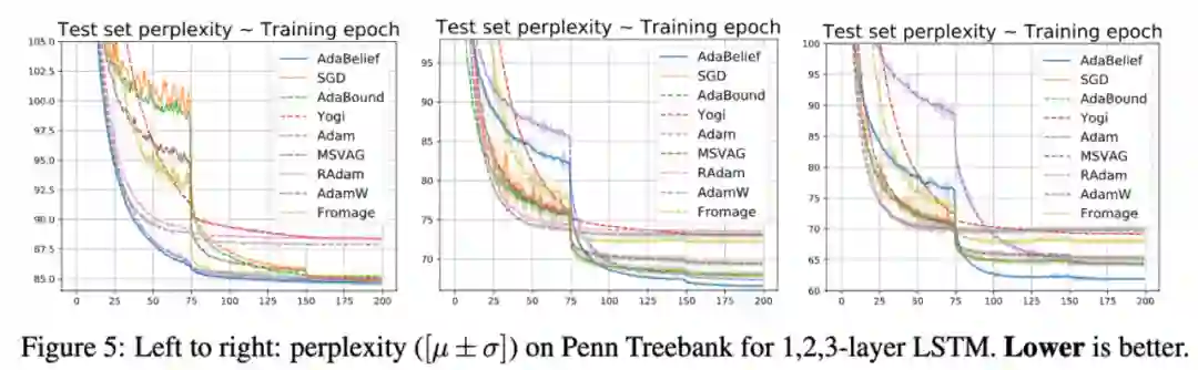 研究者在Penn TreeBank数据集上利用LSTM进行了实验,测试集上的困惑度(perplexity)如图5所示(越低越好)。对2层和3层LSTM模型来说,AdaBelief都实现了最低的困惑度,验证了其具有自适应方法的快速收敛性和良好的准确率。对于1层模型而言,AdaBelief的性能接近于其他优化器。