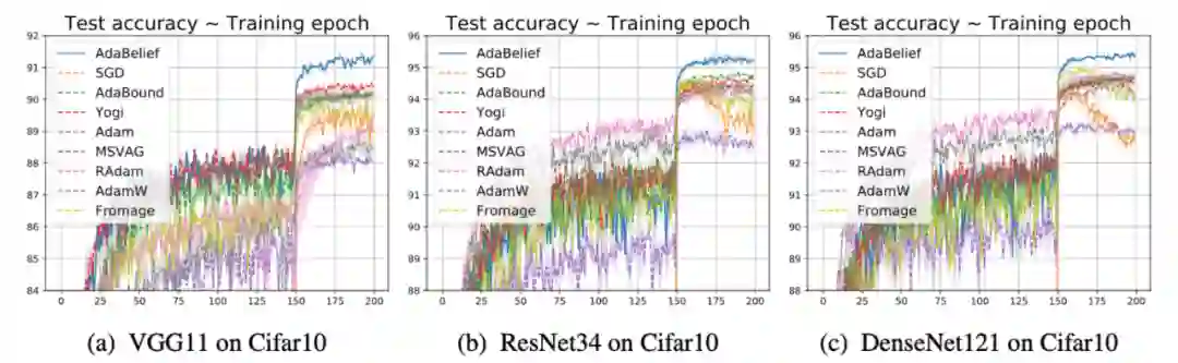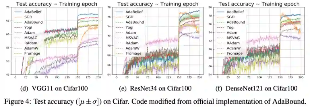 研究者在Cifar10和Cifar100数据集上利用VGG11、ResNet34和DenseNet121进行了实验。如下图4所示,AdaBelief与自适应方法(如Adam)一样实现了快速收敛,同时比SGD和其他方法具有更高的准确率。