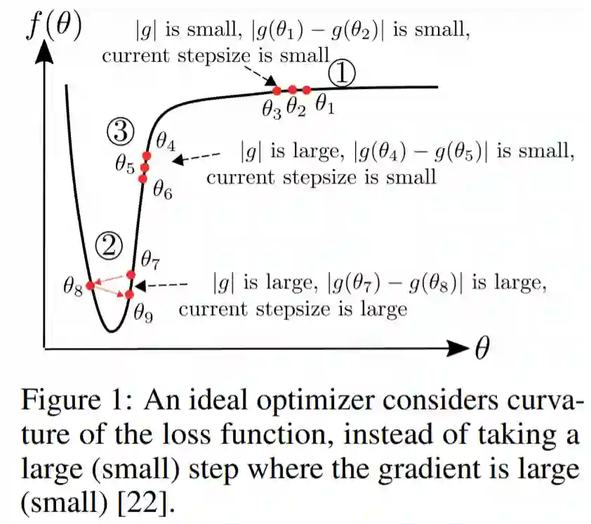 一个理想的优化器会考虑损失函数的曲率,而不是在梯度很大(或很小)的地方采取很大(或很小)的步长。上图中的区域③展示了AdaBelief在「梯度大,曲率小」的情况下相较于Adam的优势。