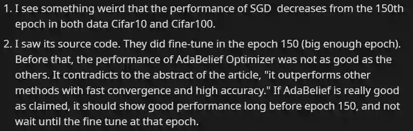 虽然效果看起来不错,但论文发布后也引发了一些质疑,比如:「在Cifar10和Cifar100的数据中,SGD的性能在150个epoch之后才开始下降。他们在150个epoch处进行了微调。在此之前,AdaBelief并没有其他优化器性能好。」