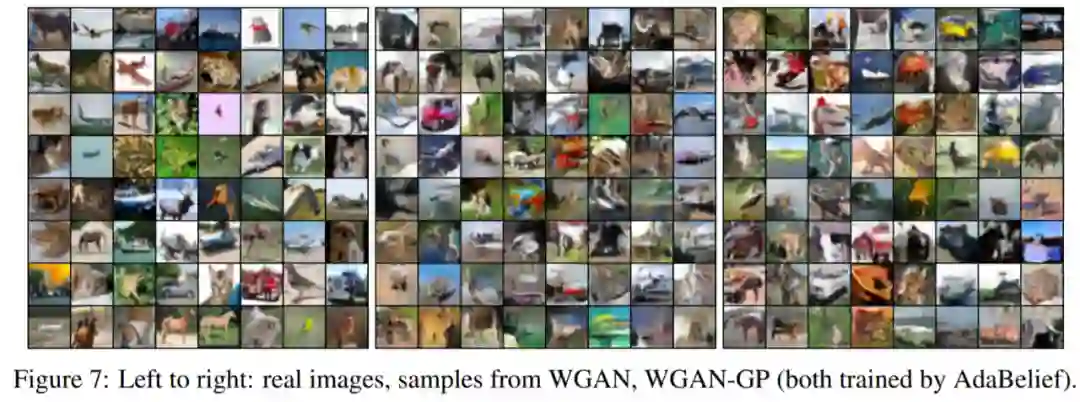 此外,在 Cifar10 上训练 GAN 期间,与经过调整的 Adam 优化器相比, AdaBelief 表现出了高度稳定性并提高了生成样本的质量。