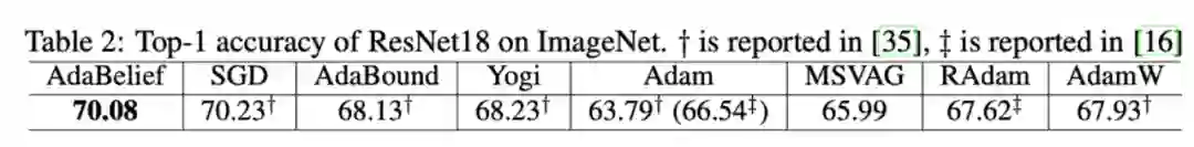 研究者还在ImageNet上训练了ResNet18,验证集上的准确率如表2所示。从结果可以看出,AdaBelief优于其他自适应方法,并达到了与SGD相当的准确率(70.08VS70.23),这缩小了自适应方法与SGD之间的泛化差距。