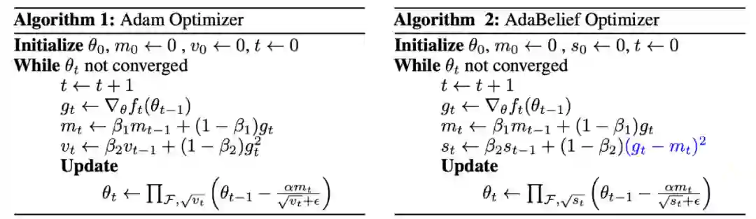 Adam和AdaBelief的算法如上图所示,不同之处已经用蓝色字体标注。从图中可以看出,AdaBelief没有引入额外的参数。为了简便,研究者省略了偏置矫正步骤。具体来说,在Adam中,更新方向是