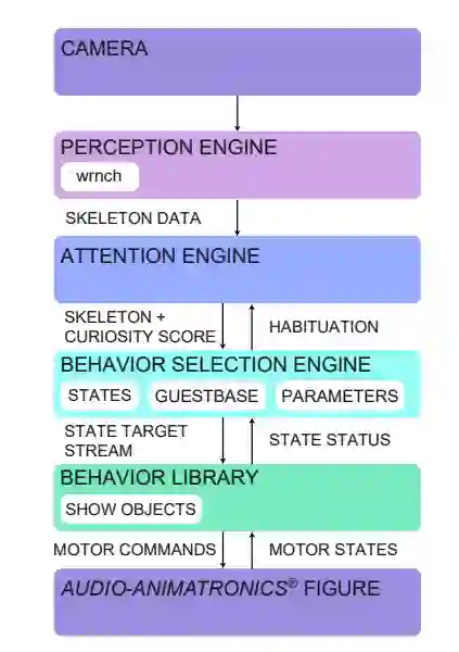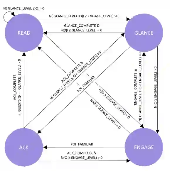 行为选择引擎是机器人角色系统的组成部分,它代表角色的高级推理。该组件包含一个手工制作的状态机,用于指导机器人处于哪种行为状态。行为选择引擎还维护有关机器人参数的信息(例如,当前状态,好奇阈值,状态超时时间),以及摄像头看到的骨架。