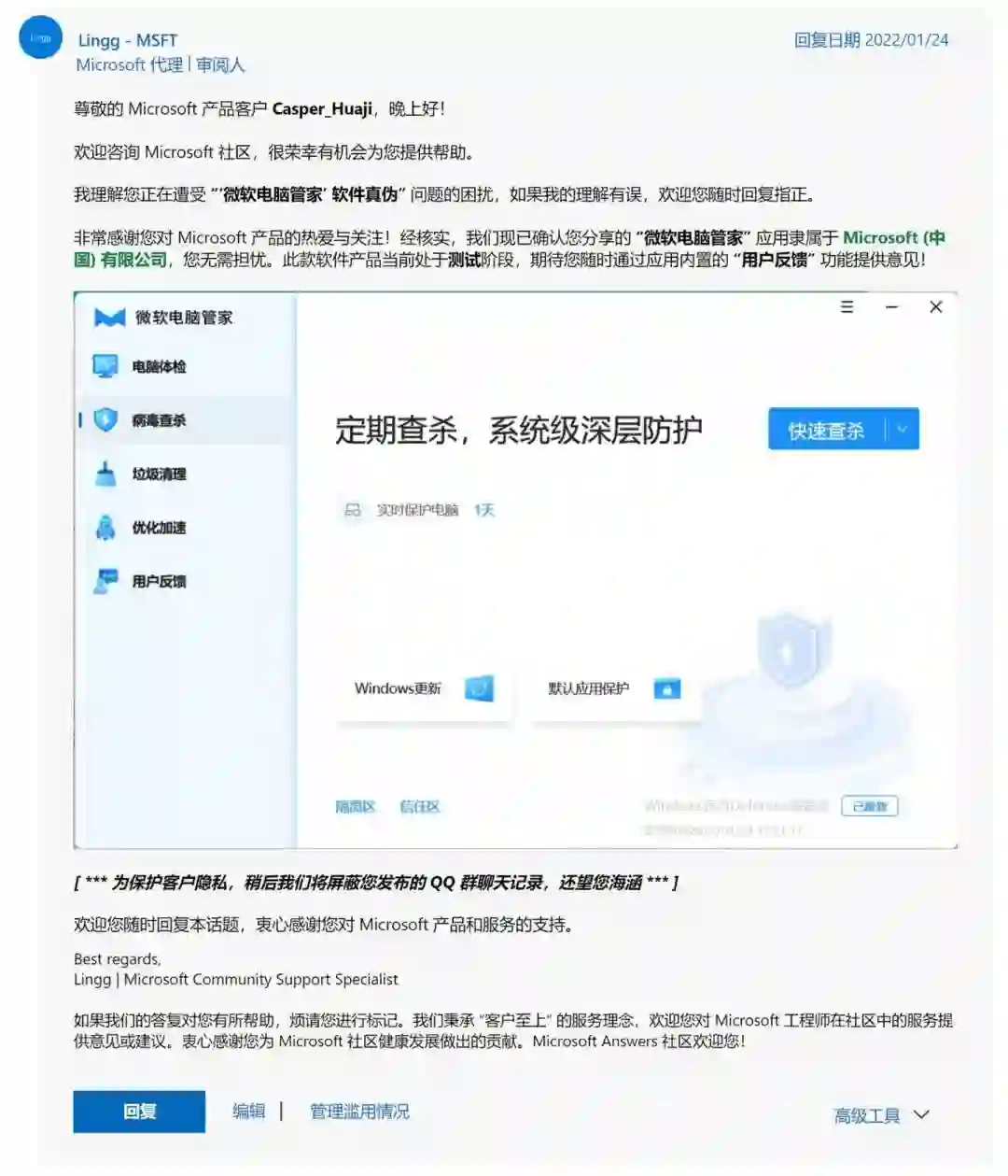 虽说这款软件长得颇似国内软件厂商作品,几乎看不到微软官方的设计风格,但据微软官方人员在微软社区的反馈,该软件确实隶属于微软(中国)有效公司,当前处于测试阶段。而出现不到一天,该软件便已宣告测试结束,指向微软的下载链接也已经失效。