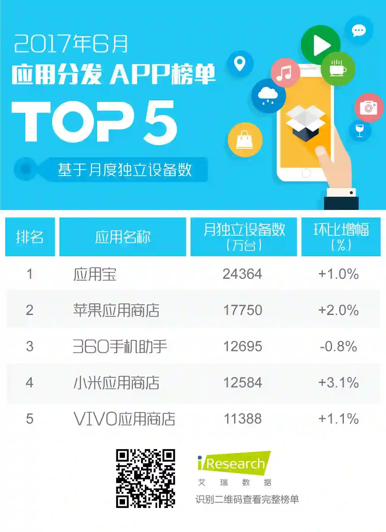 与五月相比,应用分发类TOP5成员及排序保持一致,共计包括3个厂商商店类APP以及2个应用商店类APP,整体而言,月独立设备数的变化幅度都较小。厂商商店类APP中,5月表现亮眼、增速一度超过90%的VIVO应用商店的增长显著放缓,但与4月相比,其月独立设备数已翻倍,此外,苹果和小米应用商店增长稳定;应用商店类APP中,应用宝以2.4亿的月独立设备数继续卫冕,360手机助手的月独立设备数出现小幅下降。