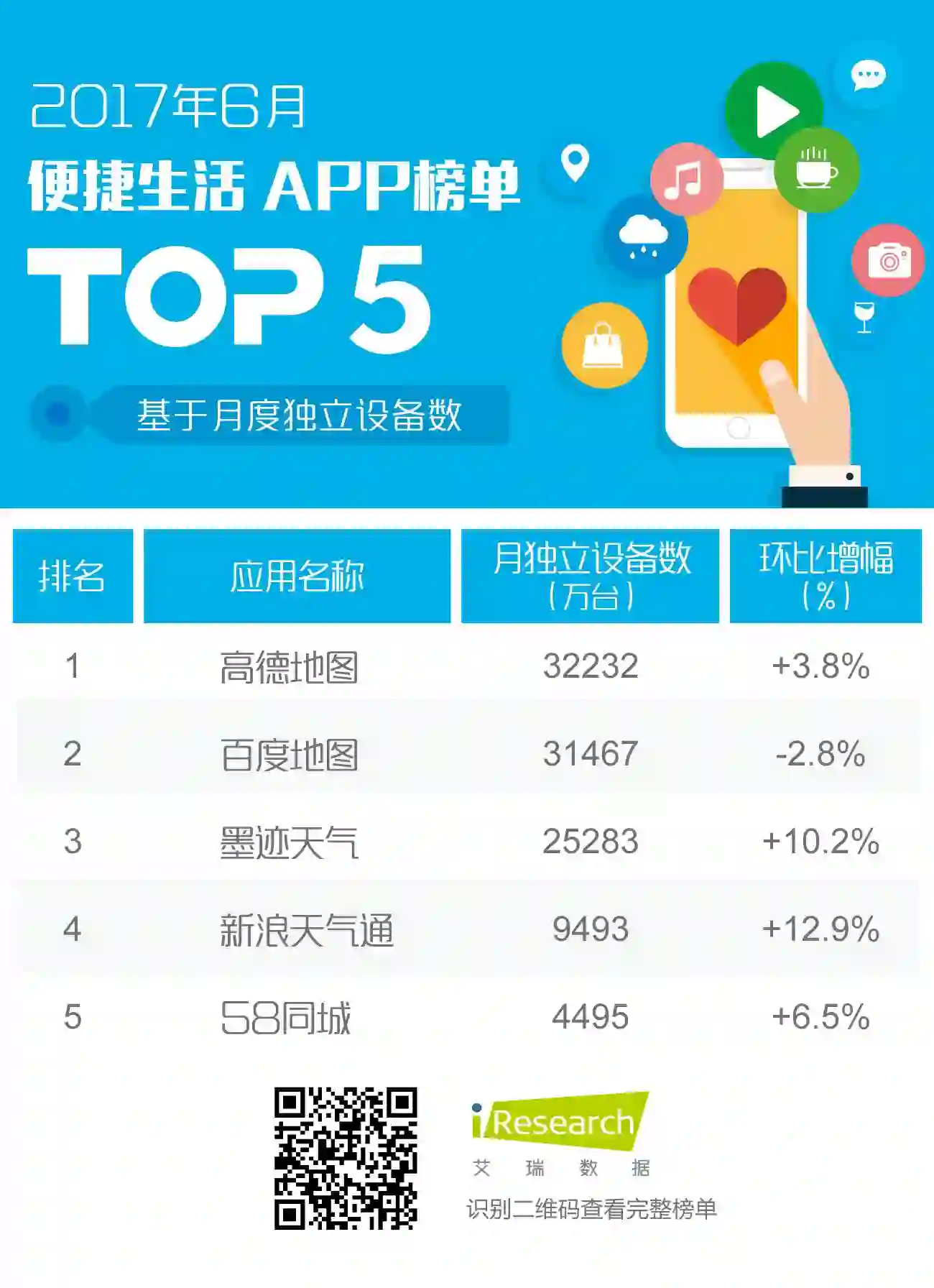便捷生活类TOP5共计包括2个导航地图、2个天气类APP以及1个分类信息提供商。导航地图中,高德地图和百度地图战事胶着,六月,高德地图以3.8%的增速反超百度地图,问鼎便捷生活类应用TOP1;而受到夏季多变天气的影响,网民对天气类APP的关注度显著提升,墨迹天气和新浪天气通月独立设备数增幅均超过10%,整体增长势头良好;此外,58同城也持续保持着高于5%的增速稳定增长。