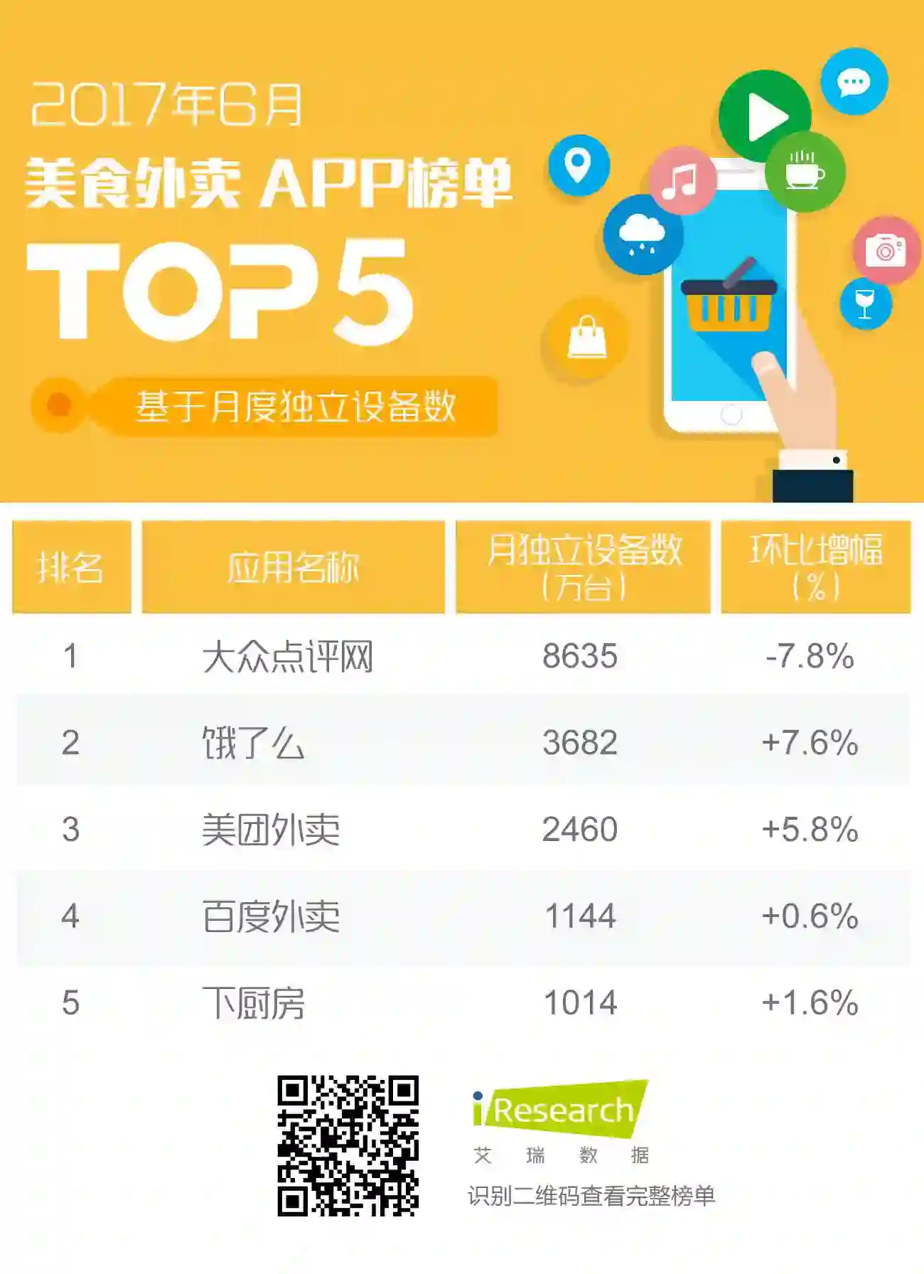 与四月、五月相比,美食外卖类TOP5成员及排序保持一致,共计包括3个外卖软件以及2个美食类APP。外卖软件中,饿了么和美团外卖的月独立设备数增长稳定,增速分别达到7.6%和5.8%,而百度外卖的增长则相对缓滞;美食类APP中,大众点评网月独立设备数的降幅虽然达到7.8%,但仍稳居美食外卖类TOP1,而下厨房则通过不断缩小负增长幅度,最终扭负为正,实现小幅正增长。