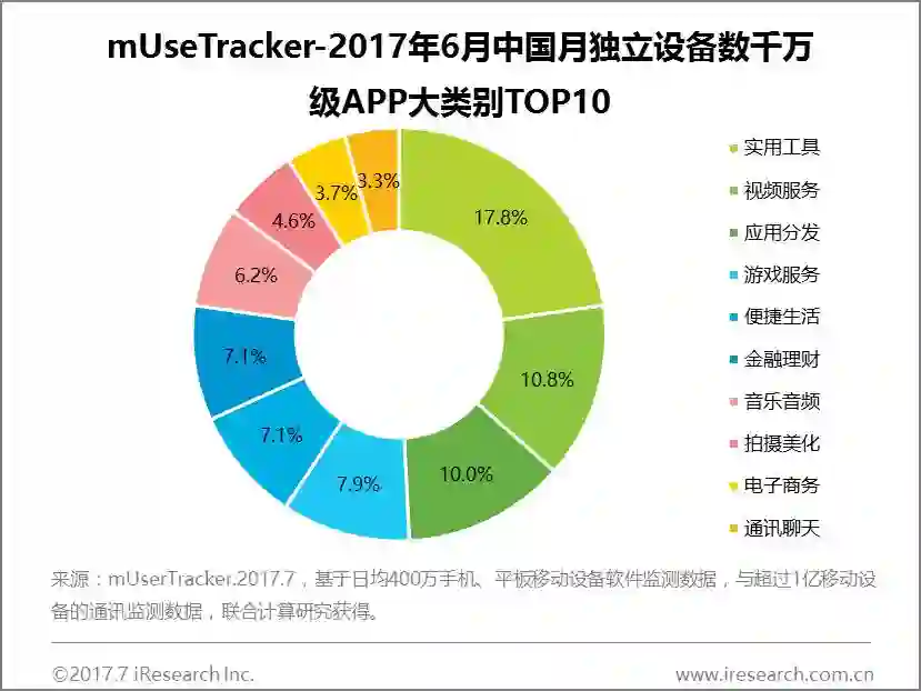 2017年6月,移动端整体月独立设备数达到11.2亿,环比增长1.4%。其中,月度独立设备数量达到千万级的App共有241个,与5月份相比,数量上增长了13个。千万级以上成员共包含21个大类,TOP10类别中,实用工具类仍然高居榜首,共包含43个千万级APP,占比达到17.8%;视频服务和应用分发两大类别分居第二、三位,占比也均接近10%。