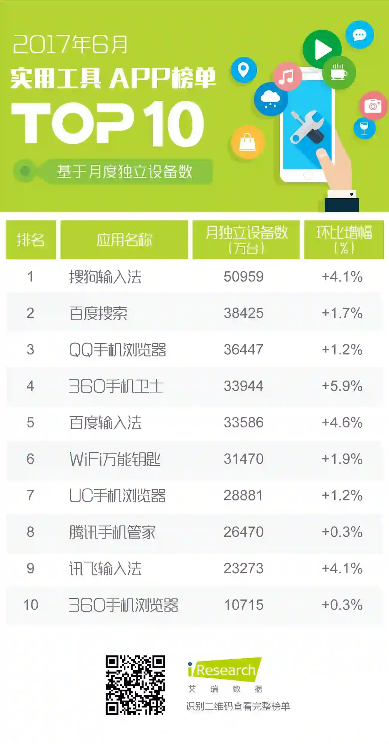 与五月比,实用工具类TOP10成员不变,共计包括3个输入法、3个浏览器、2个安全工具、1个搜索引擎以及1个WiFi工具,其中,搜狗输入法仍为领军者。输入法中,搜狗、百度和讯飞月独立设备数的增长率均超过4%,整体增势较快;浏览器中,QQ和UC手机浏览器的增长率均为1.2%,360手机浏览器的增长率则相对较低;安全工具中,得益于前段时间在勒索病毒爆发事件中的快速反应,360手机卫士月独立设备数涨势迅猛,达到5.9%。