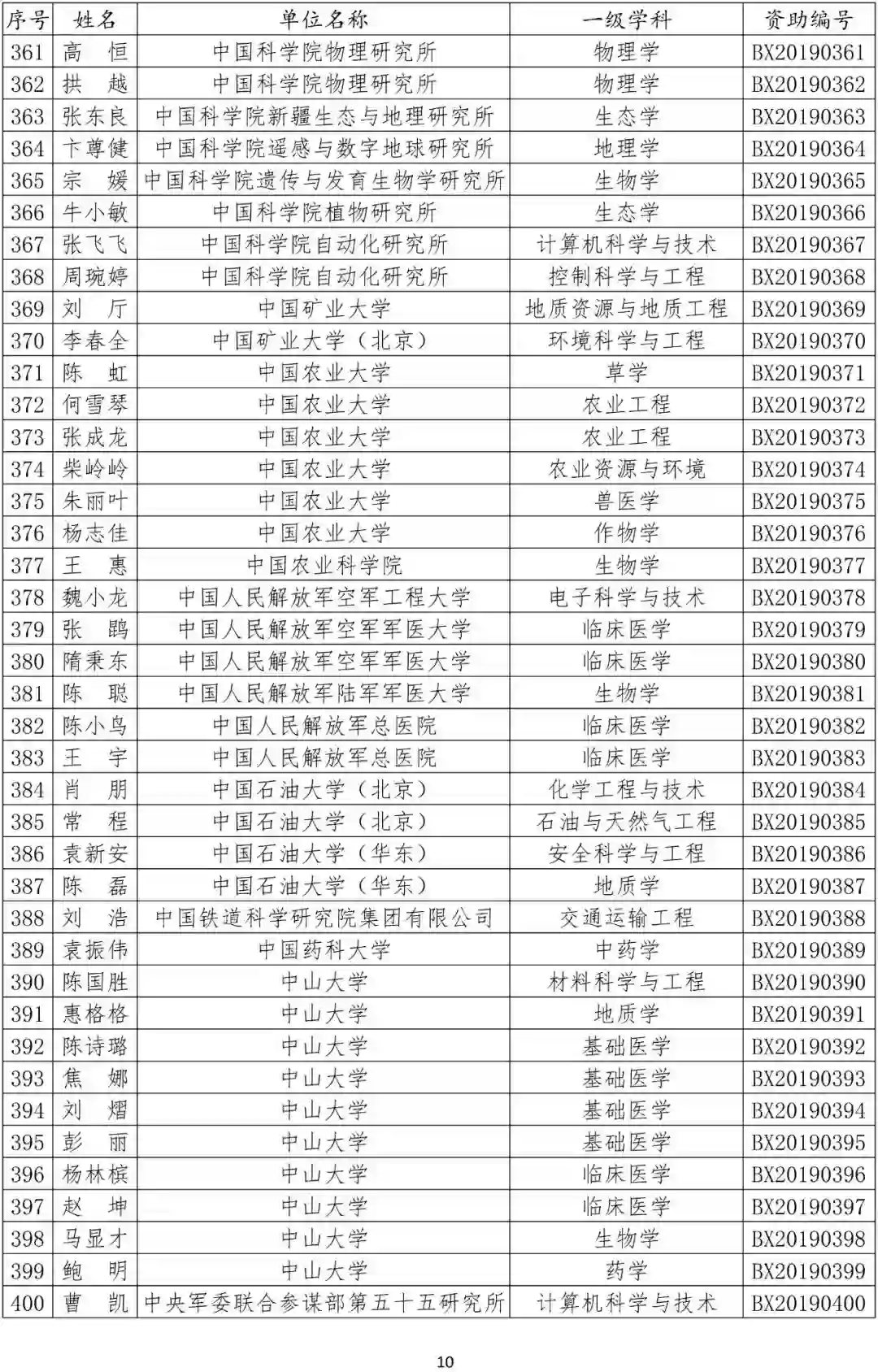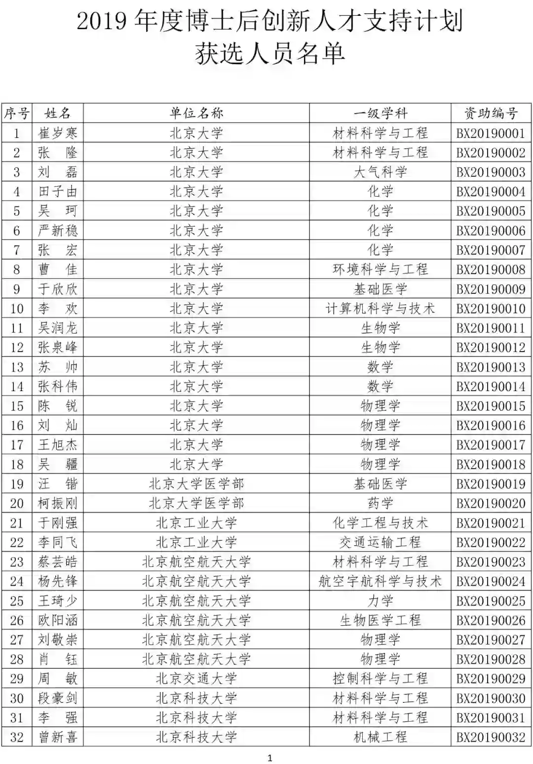 根据《人力资源社会保障部 全国博士后管理委员会关于印发博士后创新人才支持计划的通知》(人社部发〔2016〕33号),全国博士后管委会办公室、中国博士后科学基金会组织开展了2019年度博士后创新人才支持计划(以下简称“博新计划”)的申报和评审工作,最终确定了400名获选人员,今天(4月18日)正式公布了名单。