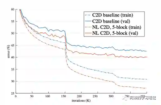总结:作者根据非局部均值滤波方法提出了非局部神经网络(NLNN),综合考虑节点间不同位置之间的关系,同时也具有较强的灵活性,支持自定义相似函数,并支持在不改变网络结构的情况下以残差的形式接入到现有网络中,最后通过实验表明,这种非局部运算的框架具有非常显著的效果。