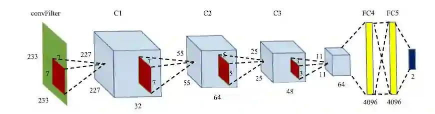 我们所采用的网络结构由 ConvFilter 层,3个卷积层组,2层 FC 层以及1个softmax 分类层组成,模型的输入是二进制的图片格式。其结构如下图2所示:我们的输入是一张233*233的 RGB 图像,用绿色方块表示;红色方块代表卷积核,靠近它的数字代表该卷积核的尺寸,左侧的红色方块代表一个7*7的卷积核;特征图则由阴影部分的长方体所示。
