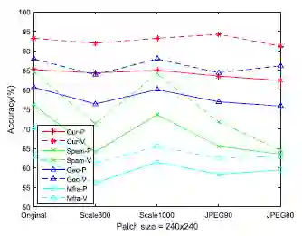 我们的方法在 Google 和 PRCG 数据库上都表现出良好的识别性能,而且对调整图像大小和压缩 JPEG 等后处理操作有强大的鲁棒性。