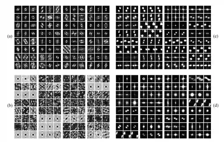 在计算机视觉任务中,CNN 的训练普遍存在一种现象:即模型在第一层学习的卷积核类似于 Gabor 滤波器和 color blobs。我们在下图 5 展示了模型的卷积可视化结果,其中 (a) 表示我们模型的第一层卷积核的傅里叶变换 (FFT) 结果, (b) 表示预训练的 CaffeNet 的结果,(c) 是对应于 CaffeNet 中第一层的前96个卷积核的可视化结果,而 (d) 则对应于最后的96个结果。滤波器根据三个颜色通道 B,G 和 R 被分为3个组,而像素越亮则代表所对应的B,G,R的值越高。