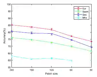 下图 3 展示了我们的方法与三种人工设计特征的方法在不同尺寸图像块上的分类精度。与其他三种方法相比较,我们的方法在任何图像块尺寸上的准确率都更高,且随着图像块尺寸的缩小,网络的分类准确率会降低。