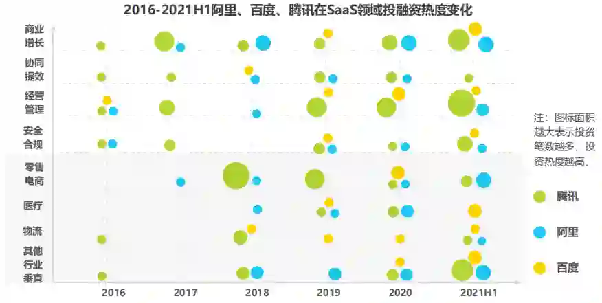 大厂不仅维持着对商业增长类和经营管理类的SaaS高关注度,对安全合规类SaaS的投资热度也有明显的提升。并且相比2016年,互联网大厂开始增加对行业垂直领域的SaaS投资,加速SaaS的产业端落地。