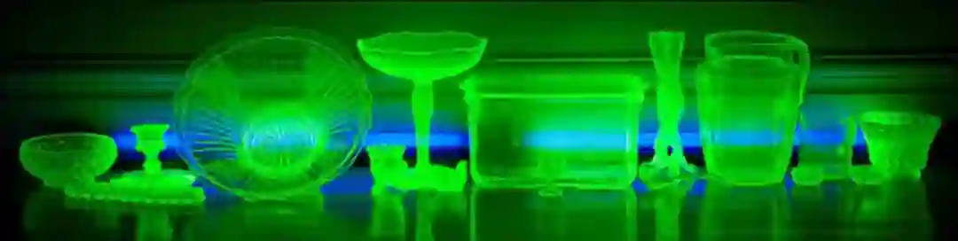 图3. 各种铀玻璃器皿在紫外线黑光下发出荧光(图源:wikiwand.com)