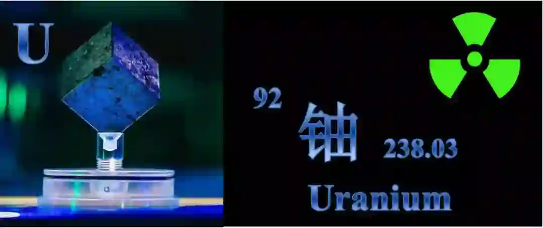 铀(Uranium)处于元素周期表第七周期,是最为常见的锕系元素之一。其原子序数为92,也是天然存在的最重元素(图1)。自然界中的铀通常以三种同位素的形式存在:U-238(自然丰度99.275%,原子量238.0508,半衰期4.51×10⁹a),U-235(自然丰度0.720%,原子量235.0439,半衰期7.00×10⁸a),和微量的U-234(自然丰度0.005%,原子量234.0409,半衰期2.47×10⁵a)。