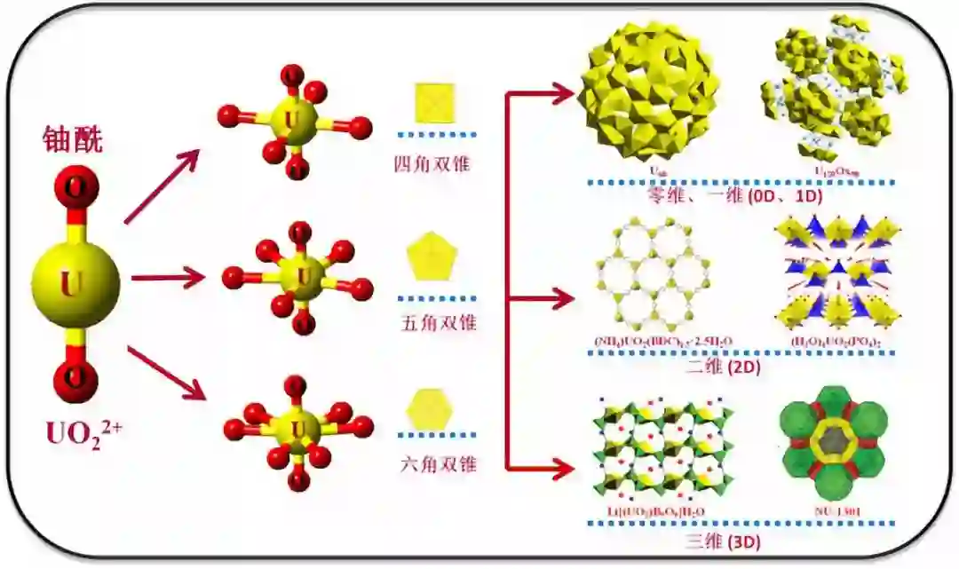 22+的分子轨道是由U的5f/7p/6d轨道与O的2p轨道杂化后形成。其中,U=O键的作用力较强,因此铀酰上的氧表现出一定的化学反应惰性。从而导致六价的铀酰化合物形成独特的配位构型:多角双锥多面体结构。基于其独特的配位构型,具有零维、一维、二维或三维的各种新颖独特的铀酰化合物被层出不穷的报道出来(图8)。