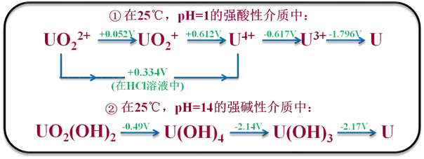 UO22+(黄色),分别对应U(III)、U(IV)、U(V)和U(VI)。其中三价U(III)不稳定, 具有强的还原性;而铀(V)和铀(VI)具有一定的氧化性;同时铀(V)很容易发生歧化反应生成稳定的铀(IV)和铀(VI),而这两种价态也是铀最为常见的两种价态(图7)。